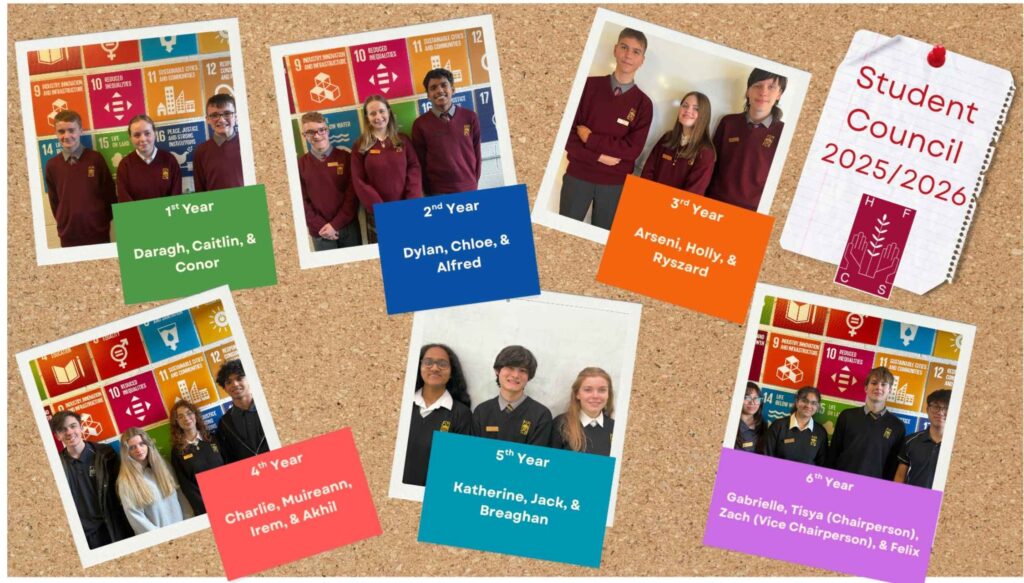 The Student Council help organise Parent/Teacher meetings, Open Days and Nights. The Student Council involves elected students from 6th Year, who act as a representative body for all students. These students are encouraged to make recommendations and improvements in connection with school policy.